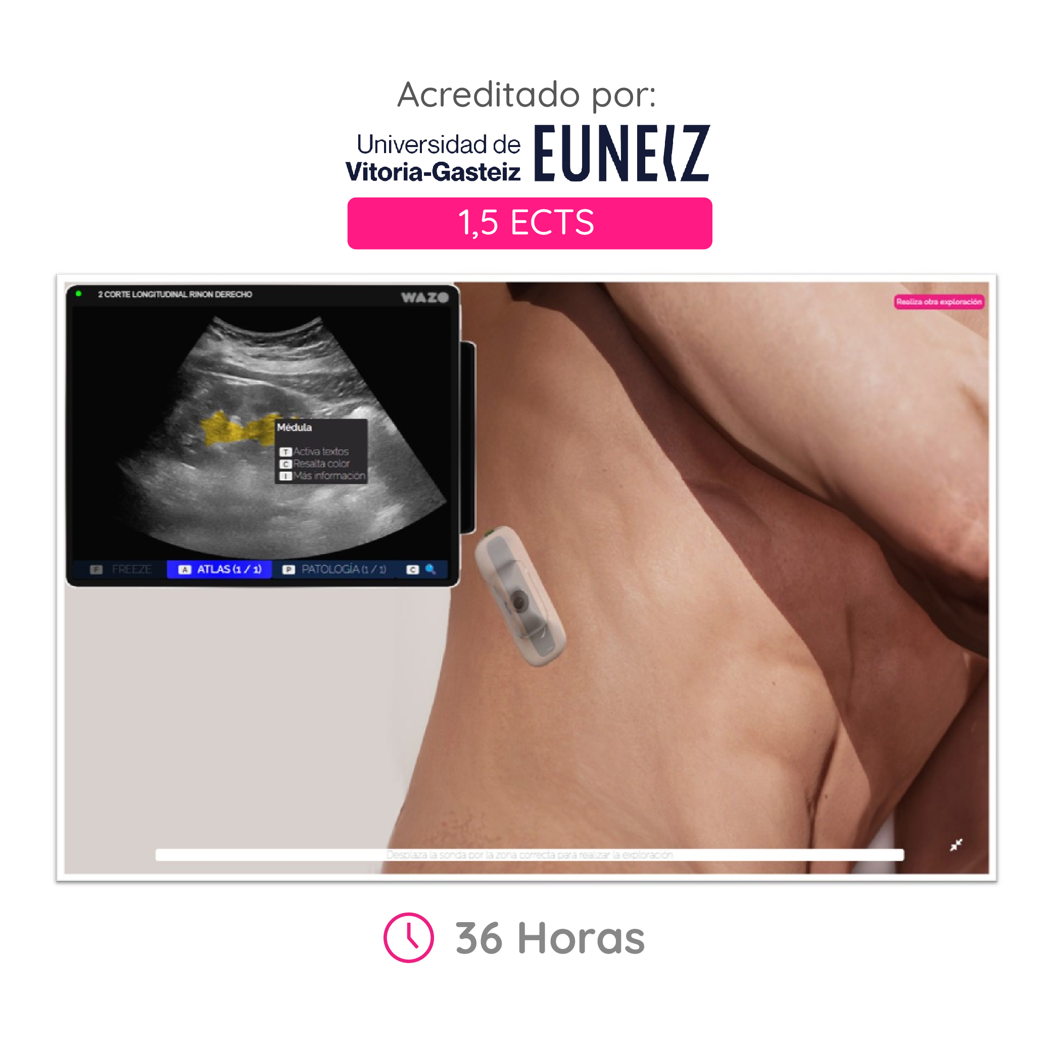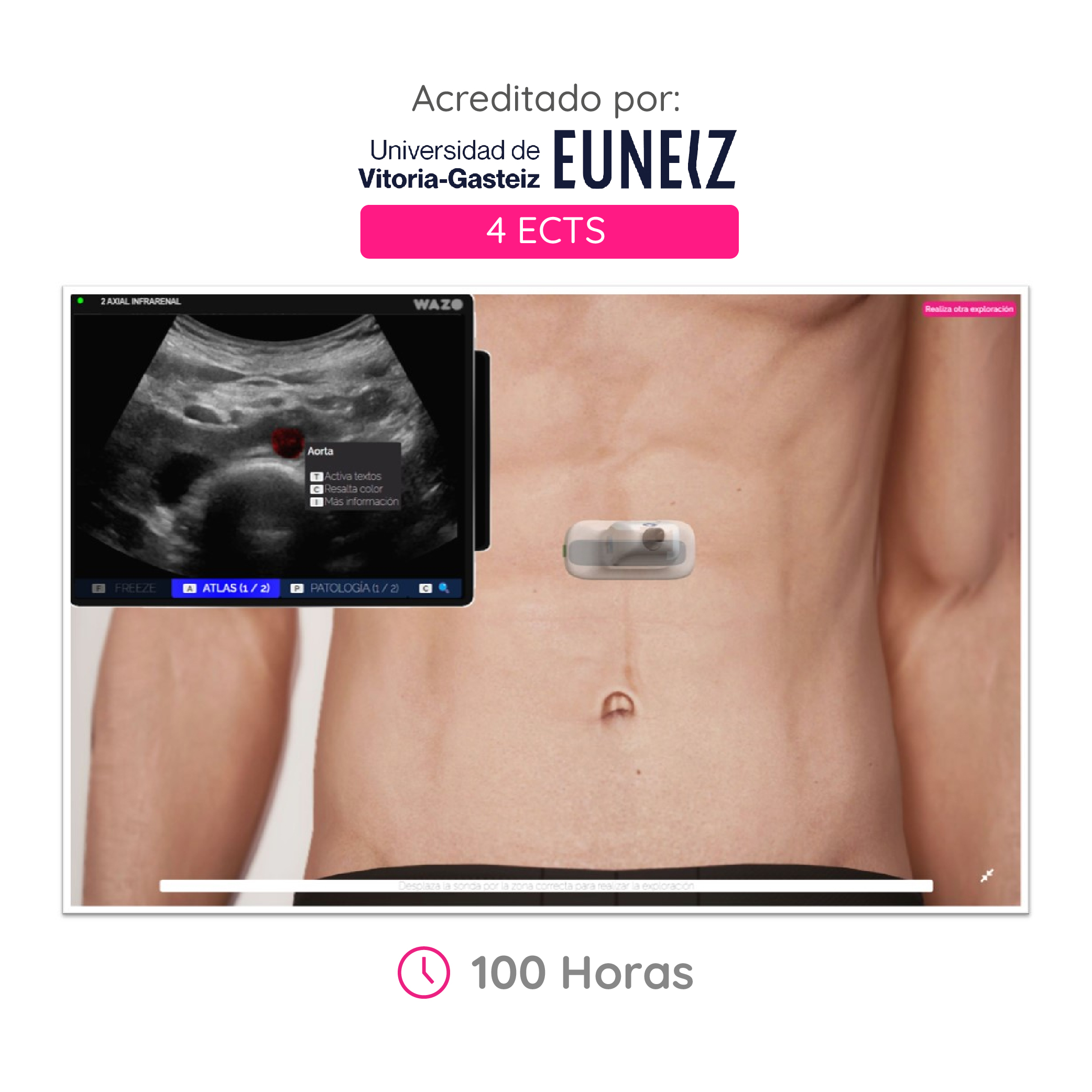 Cada módulo contiene un entorno interactivo que te permite hacer prácticas de exploraciones con ecógrafos virtuales.
